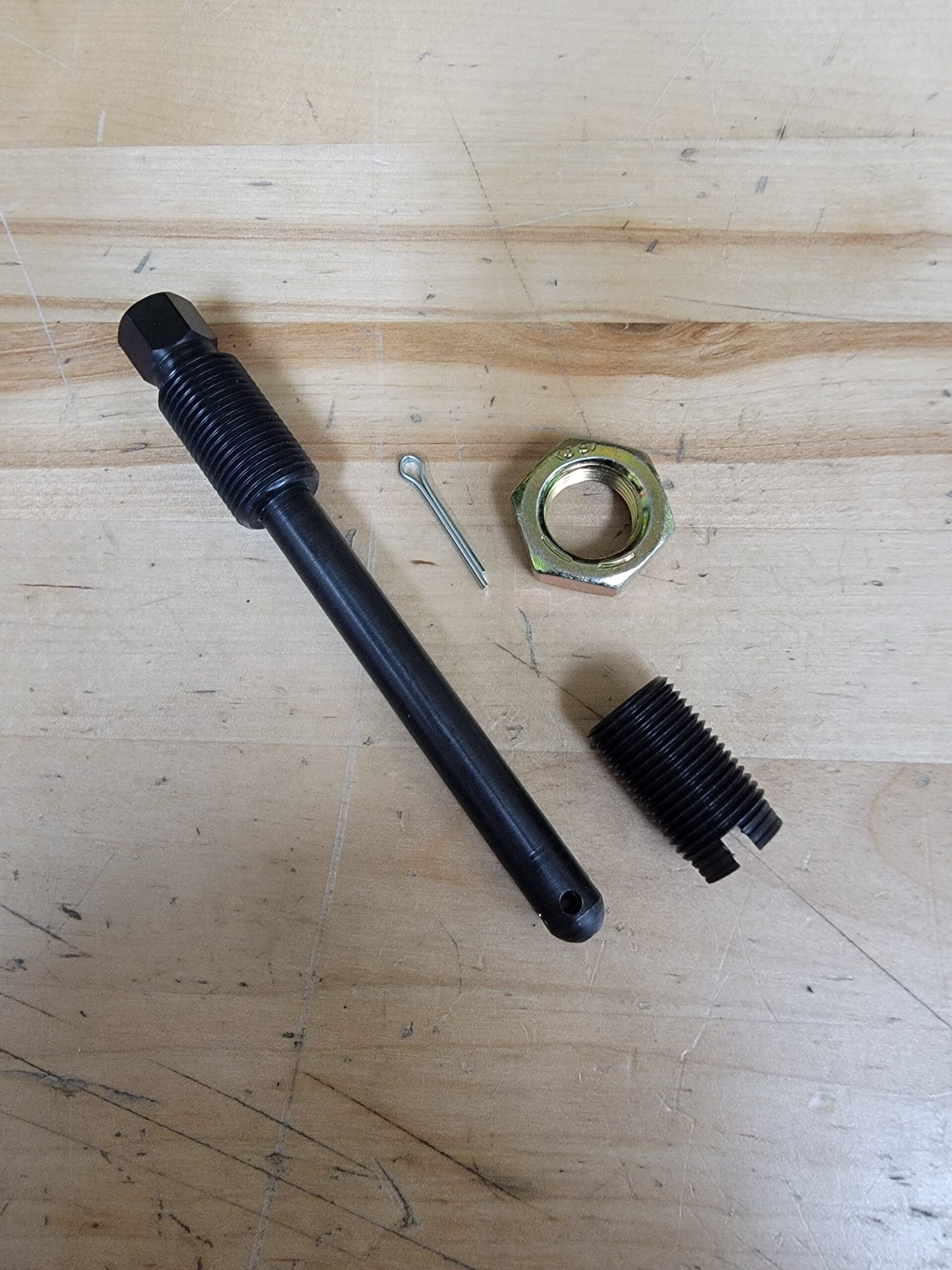 BRE short kingpin for use with all fabricated spindles. This is a one-piece billet central body kingpin made from premium steel. The hex head and threaded portion are drilled hollow to reduce weight. Will work with BRE-type spindles; adjust the kingpin down to install the cotter pin.